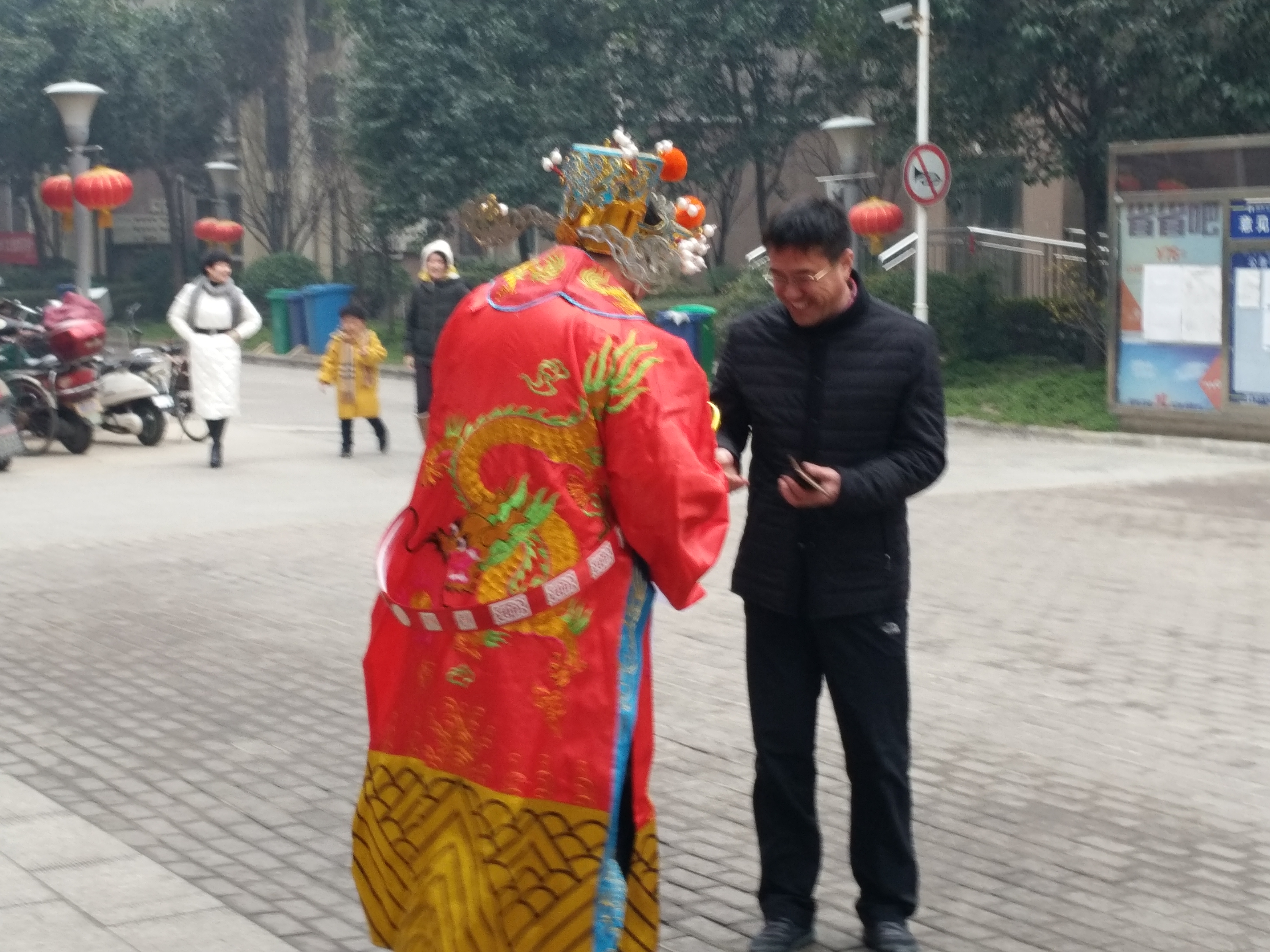 大年初一的一大早,我們物業的工作人員就穿上了扮演財神的服裝,抱起金元寶,拿起紅包便出發了。在小區里,看到業主就一邊送新年祝福一邊送紅包,出行的業主看到我們工作人員扮成的“財神”,也都紛紛圍過來為自己新年的第一天討個好彩頭。