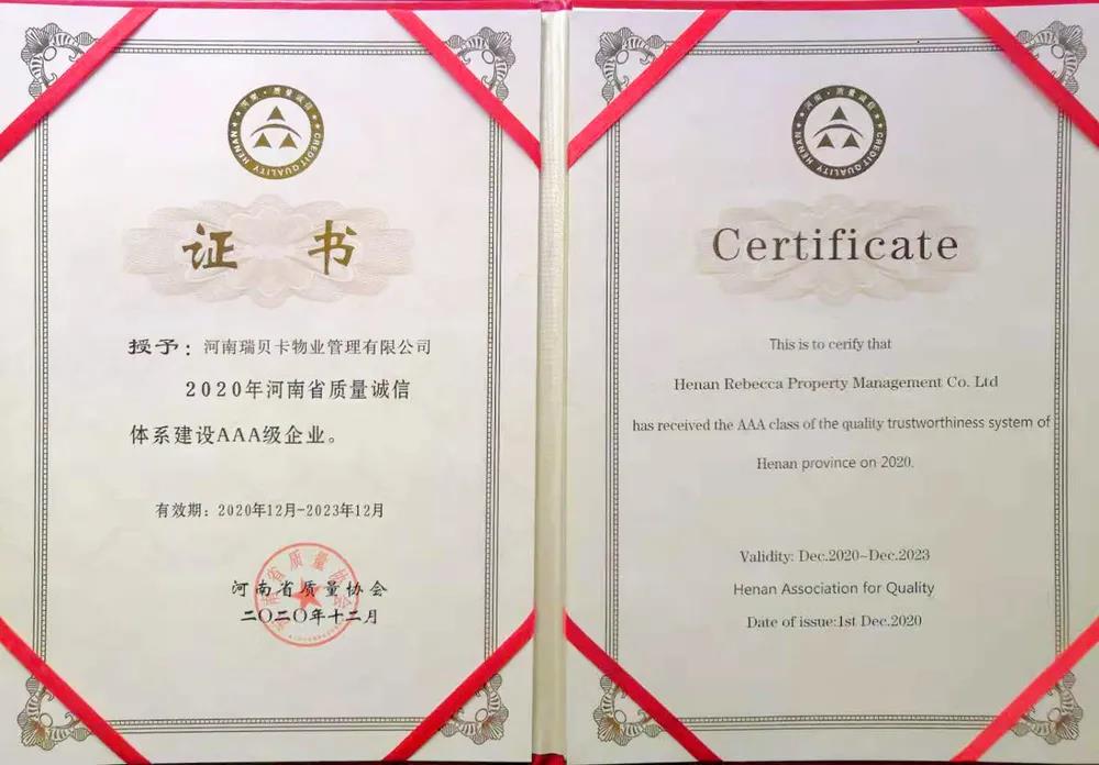 11月18日,在安陽舉行的河南省質量誠信體系建設經驗交流會上傳出好消息,瑞貝卡物業公司喜獲2020年河南省質量誠信體系建設AAA級企業殊榮。是2020年許昌物業行業首家,也是河南省物業服務行業唯一一家!