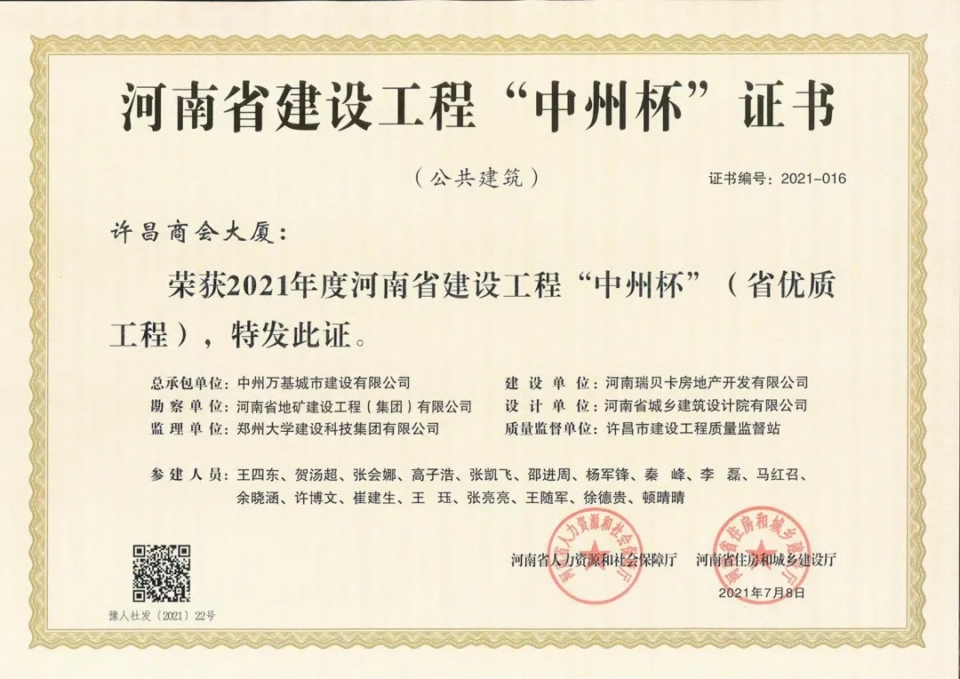 近日,從河南省人社廳、省住建廳傳來喜訊:由瑞貝卡地產承建的許昌商會大廈項目榮獲2021年度河南省建設工程質量最高獎——“中州杯”獎。這是繼獲評“河南省建筑工程安全文明標準化示范工地”后,商會大廈項目獲得的又一省級殊榮。