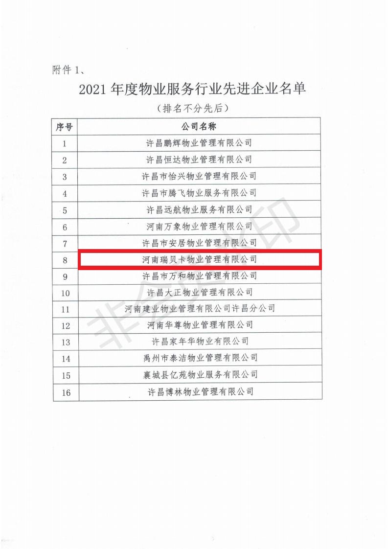 2月18日,許昌市物業管理協會發布《關于表彰2021年度許昌市物業服務行業先進企業、項目和個人的決定》,瑞貝卡物業憑借領先的綜合實力、卓越的服務及管理水平,榮獲多項殊榮。其中,物業公司榮獲2021年度物業服務行業先進企業榮譽稱號;許昌瑞貝卡興天下榮獲2021年度物業服務行業優秀住宅項目榮譽稱號;瑞貝卡物業陳曉寧、程敏、李艷紅、廖志磊、毛吉林、裴海軍榮獲2021年度“最美物業人”榮譽稱號!