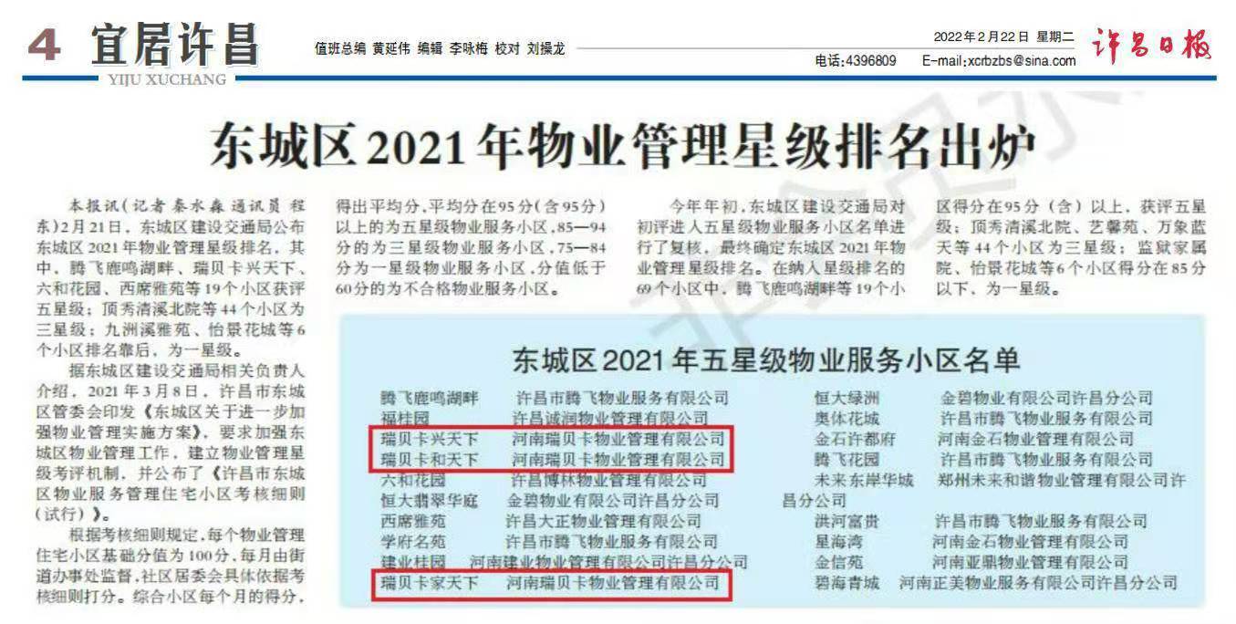 今年年初,東城區2021年物業管理星級考核中,許昌瑞貝卡興天下、許昌瑞貝卡和天下、許昌瑞貝卡家天下在規范化管理、經營管理制度、精神文明建設、客戶滿意度、公共設施設備保養、社會公益事業等方面表現突出,得高分,獲評五星級。
