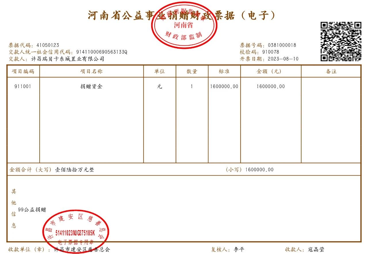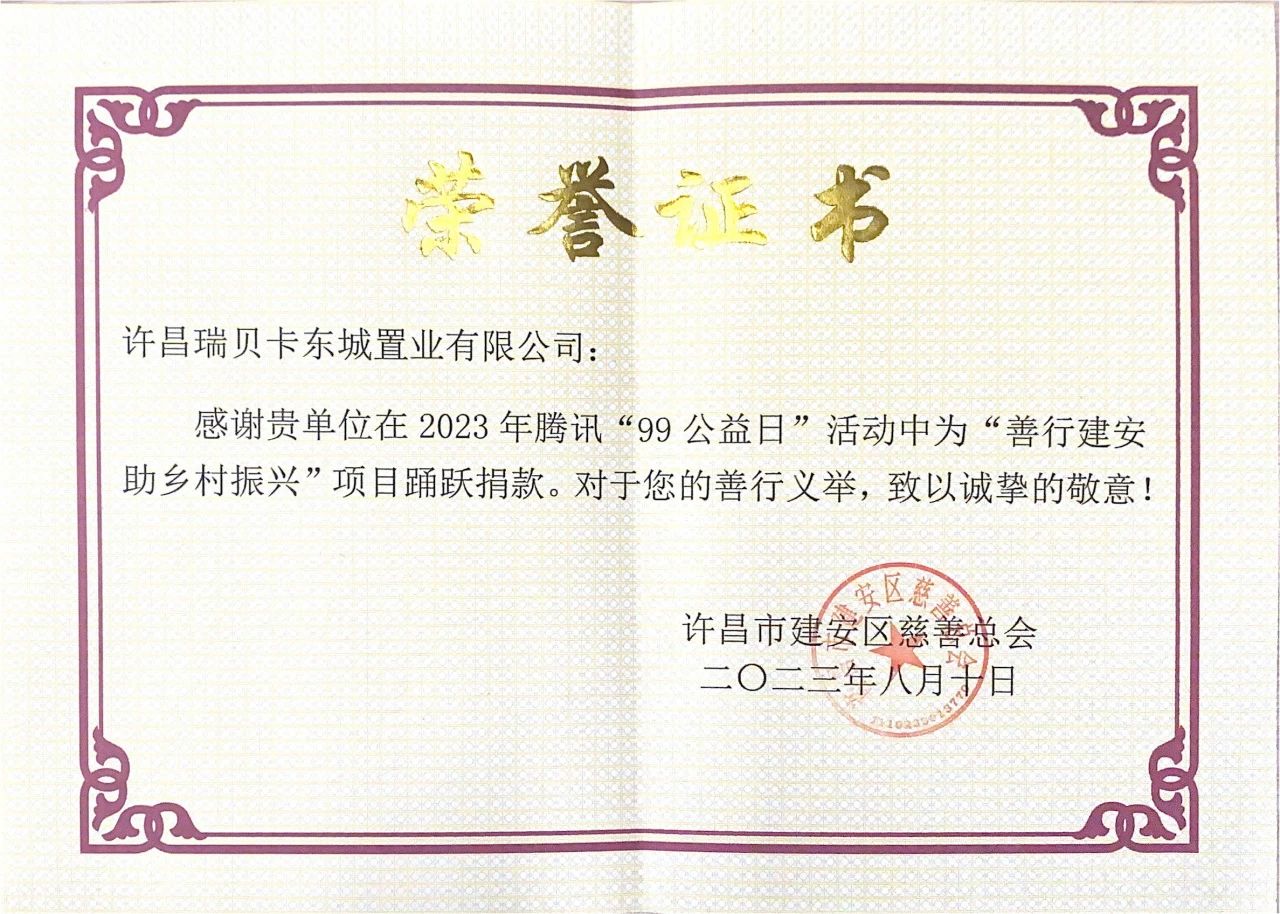 2023年8月10日在“99公益日”活動中,瑞貝卡地產向建安區慈善總會捐款160萬元,用于“善行建安助鄉村振興”項目。