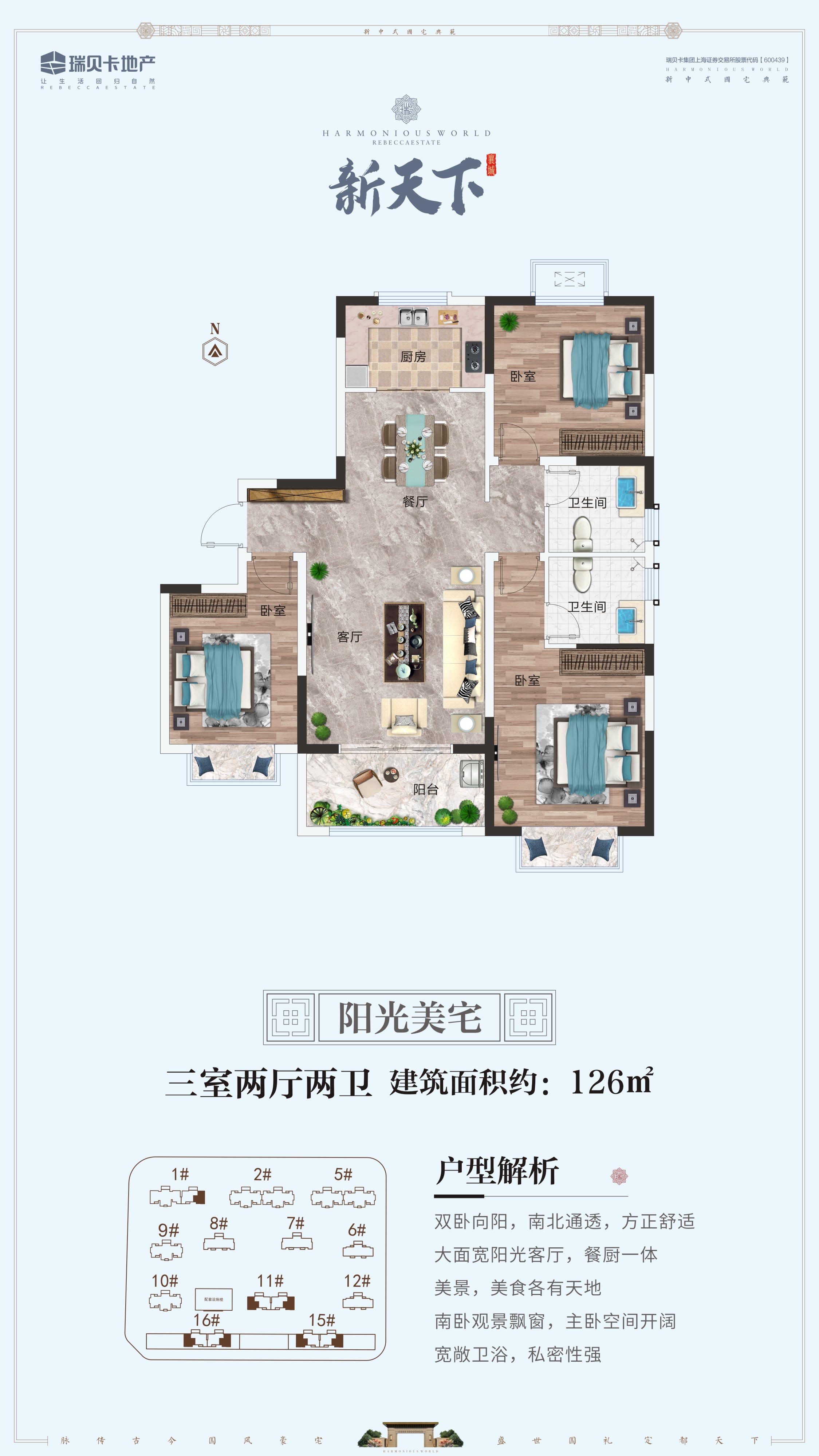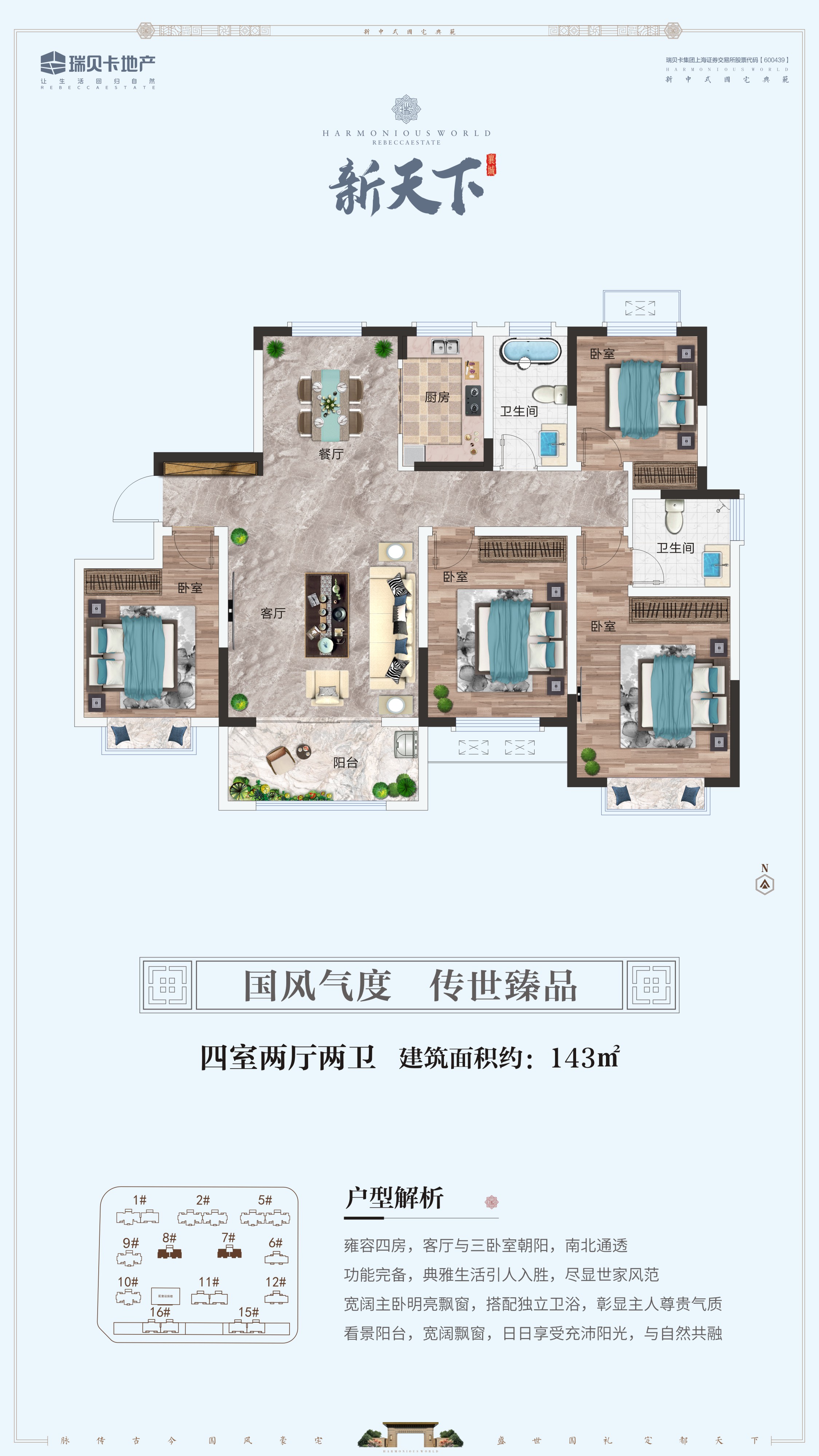 首頁 > 地產力作 > 襄城縣項目襄城瑞貝卡新天下是河南瑞貝卡地產在襄城的第四個樓盤。瑞貝卡地產進駐襄城12年來,相繼開發了家天下、和天下、興天下3個高檔社區,服務數萬業主。 2019年,推出天下系扛鼎之作——新天下,該項目位于襄城縣中軸百寧大道東側,文昌路北側,占地約150畝,超低1.8容積率,綠地率37%,全17層建筑,規劃戶型面積區間115—142平米。整個小區采用圍合式布局,新中式風格建筑,中式園林景觀,盡可能的保證每家每戶采光和通風。